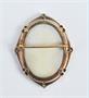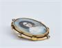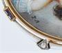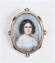 zlatá brož s miniaturou dívky, malba na slonové kosti, pod sklíčkem, rámeček s bílým emailem, drobnými safíry a diamantovými routami, Au btto 7,56g/580/000, Rakousko-Uhersko, Vídeň, kolem roku 1910, miniatura signovaná monogramem; výška 3,8 cm, délka 3 cm