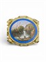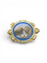 Zlatá brož zdobená krajinným výjevem ve formě drobné mozaiky.