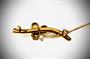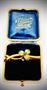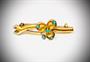Zlatá brož zdobená matováním povrchu a čtyřmi tyrkysy. Zlato ryzosti 585/1000, celková váha: 5,80 g. Precizní zlatnické zpracování. Osvědčení Puncovního úřadu s fotografií. Brož je lehce poškozena na zadní části vedle háčku (malá dírka), viz foto. Délka: 4,3cm. Krabička není součástí nabídky.