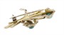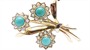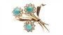 Zlatá brož s tyrkysy a perličkami. Žluté zlato 375/1000. Perličky. Přírodní tyrkysy. Signováno: Cropp & Farr. Velikost brože: 3,7 cm x 2,7 cm.