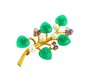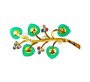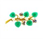 Půvabná brož zdobená drahými kameny, perlami a chryzoprasem. Šperk byl zhotoven ze 14ti karátového zlata (585/1000), o celkové hmotnosti 12,23 g. Zdobí jej ručně vyřezávané acháty, perly rubíny, safíry a brilianty. Rozměry cca 6 x 3,2 cm. Perfektní stav.