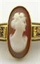 Žluté 14 karátové zlato, mušlovina. Ryzost Au 585/1000, celková hmotnost 3,68 g. Autor brože: Dana Kotěšovcová. Oválná svislá kamej s portrétem dívky zasazená ve zlatém rámečku do obdélné brože. Horní část brože ve tvaru stuhy zdobená gravírovaným ornamentem. Bezpečnostní uzávěr. Značeno: ryzost 585, mistrovská značka, český punc hlava labutě. Česká republika, po roce 1993. Délka 45 mm, výška 21 mm.