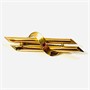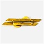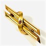 Elegantní brož ve stylu pozdního biedermeieru, tělo složeno z dvou souběžných zkosených dříků, spojenou ladně vinutou páskou osazenou rubínovým kamenem fasovaném v hvězdicovém lůžku. Kontrastní plochy leštěného kovu a potažení matným dukátovým zlatem. Britská (Birmingham) zlatnická práce z poslední čtvrtiny 19. století.
