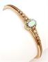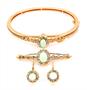 Unikátní Rakousko-uherská souprava ze zlata ryzosti 580/1000 (punc liška) zdobená dubnickými opály a diamanty. Celková hmotnost 25,70 g. Rozměry náušnice bez závěsného očka 0,9 x 0,9 cm. Rozměry náramku 5,5 x 5 cm. Rozměr brože 4,5 x 1,8 cm. Součástí sady je původní etue. Šperky jsou ve výborném stavu.
