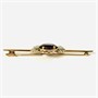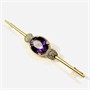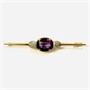 Velmi elegantní, větší podlouhlá brož, jíž vévodí přírodní sytý ametyst oválného brusu, po stranách v bílých zrnitých lůžkách doplněno přírodními diamanty kulatého jednoduchého brusu o celkové váze cca 0,12 ct (0,015 ct - 8 ks). Ramena ponechána hladká, zdobně prořezávaná hlavice. Německá klenotnická práce z 30. až 50. let 20. století.