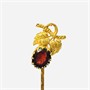 Půvabná, starožitná jehlice do kravaty či klopy, hlavice osazena přírodním almandinem oválného plochého brusu fasovaném v dekorativní krapnové koruně, doplněno a realistickou plastiku vinutých lístků s větvičkou, jemně ryto a efektně potaženo matným dukátovým zlatem. Středoevropská zlatnická práce z konce 19. či počátku 20. století.