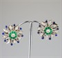 náušnice z bílého zlata s 18 diamanty briliantového brusu o celkové hmotnosti cca 0,7 ct a se 16 přírodními modrými safíry a 16 přírodními smaragdy, Au 9,74 g/750/1000, pěkná zlatnická práce, západní Evropa, kolem r. 1995; pozdější český punc (kohout); zapínání na puzetu; průměr 2 cm