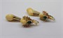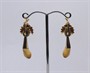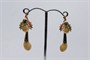 Efektní zlaté náušnice s jeleními grandlemi a chryzoprasy. Celková hmotnost 8,35 g, Au 580/1000, punc čejka (Z - 36), ryzostní číslo, značka výrobce v kartuši JH. Klasické pevné patentní zapínání, velmi dobrý stav. Republika Československá, první třetina 20. století. Celková délka náušnic 4 cm, šířka 1,3 cm.
