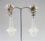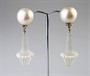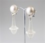 neobvyklé náušnice z bílého zlata a z matovaného přírodního horského křišťálu s perlami a diamanty, 6 drobných diamantů briliantového brusu o hmotnosti cca 0,12 ct, Au btto 20,15 g/585/1000, západní Evropa, kolem r. 1990; atest Puncovního úřadu, rozměry 5,7 x 1,6 cm