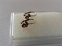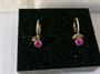 Zlaté náušničky osazené růžovými spinely, RU punc liška - Vídeň, ryzost 580/1000, celková hmotnost 1 g. Na jedné náušničce chybí jeden lísteček.