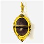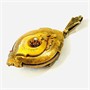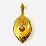 Starožitná brož z období biedermeieru, kterou lze nosit i jako přívěšek. Tělo v podobě plasticky tvarované kartuše s pohyblivou aplikací potaženou dukátovým zlatem, zdobeno rytím a osazena v krapnové koruně přírodní bílou perlou (půlperlou). Zezadu krytá oválná schránka pro fotografii či pramen vlasů. Honosnější šperk, západoevropská práce z poloviny 19. století. Zhotoveno tehdy hojně užívanou technikou plněného foukaného kovu (schaumgold).
