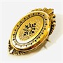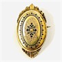 Dekorativní, půvabná brož z období biedermeieru, oválné tělo zdobeno plastickými výběžky, ve středu osazeno přírodní bílou perlou, dále bohatě zdobeno černým smaltem a paprsčitým gilošováním. Precizní západoevropská zlatnická práce z poloviny 19. století. Zhotoveno tehdy hojně užívanou technikou plněného foukaného kovu (schaumgold).