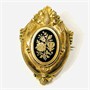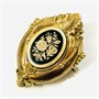 Starožitná brož z období biedermeieru, tělo v podobě plasticky tvarované kartuše, empírově stylizované ozdoby piniových šišek, volut, listů a perlovce. Ve středu osazeno oválným medailonem s florálním motivem v kontrastním černém smaltu. Honosnější šperk, západoevropská práce ze 3. třetiny 19. století. Zhotoveno tehdy hojně užívanou technikou plněného foukaného kovu (schaumgold).