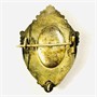 Frontální část ze žlutého 13,4 karátového zlata, tj. o ryzosti 560/1000, spodní část a zlacený medailon ze stříbra o ryzosti 790/1000, zapínání z obecného kovu; vyhotoveno osvědčení puncovního úřadu, neznačeno. Hmotnost 7,20 g, váha zlata 2,80 g dle PÚ, délka 42 mm, šířka 28 mm. Ponecháno s přirozenou patinou, lze vyčistit, v zachovalém stavu.