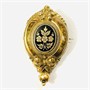 Starožitná brož z období biedermeieru, tělo v podobě plasticky tvarované kartuše s motivem květů, mašle a perlovce. Ve středu osazeno oválným medailonem s florálním motivem v kontrastním černém smaltu, připojen ověsek v podobě kuličky. Honosnější šperk, západoevropská práce ze 3. čtvrtiny 19. století. Zhotoveno tehdy hojně užívanou technikou plněného foukaného kovu (schaumgold).
