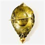 Frontální část z narůžovělého žlutého 13,4 karátového zlata, tj. o ryzosti 560/1000, kulička z 10,6 karátového, tj. o ryzosti 440/1000, spodní část ze stříbra o ryzosti 800/1000, jehla z obecného kovu; vyhotoveno osvědčení puncovního úřadu, neznačeno. Hmotnost 9,70 g, váha zlata 4,20 g dle PÚ, délka 51 mm, šířka 30 mm. Ponecháno s přirozenou patinou, lze vyčistit, místy velmi mělké promáčkliny, není téměř patrné, celkově v zachovalém stavu.