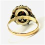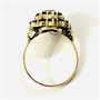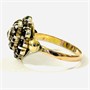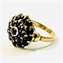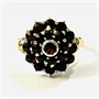 Starožitný prsten s hlavicí v podobě kulatého květu, která je ve dvou stupních osázena 21 českými granáty kulatého hvězdicového brusu, fasováno zrnkovou technikou a plně přiléhající obrubou. Německá zlatnická práce z 2. poloviny 20. století.