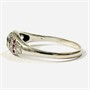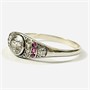 Sympatický, elegantní prsten z období art-deco. Zaoblená hlavice osazena solitérním přírodním diamantem starého briliantového brusu o váze 0,57 ct, čistota P2, barva K-L, dobrá brilance, fasováno v plně přiléhající obrubě. Dále po stranách doplněno přírodními diamanty též starého kulatého briliantového, routového a jednoduchého kulatého brusu (achtkant) brusu o váze 0,17 ct (10 ks), jejich kvalita je dobrá až nízká, v kombinaci s 6 přírodními rubíny kulatého brusu, fasováno v zrnitých krapnových lůžkách, celková hmotnost diamantů 0,74 ct. Západoevropská klenotnická práce z 20. let 20. století.