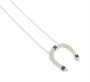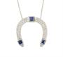 Náhrdelník ve tvaru podkovy pro štěstí z bílého zlata ryzosti 585/1000 zdobený diamanty briliantového brusu o celkové hmotnosti 0,20 ct a safíry o celkové hmotnosti 0,20 ct. Rozměr přívěsku 2 x 2 cm. Délka řetízku 43 cm. Celková hmotnost 3,62 g.