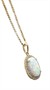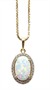 Zlatý náhrdelník s opálem a zirkony. Žluté zlato 585/1000. Syntetický opál. Kubické zirkony, celková váha 0,28 ct. Váha náhrdelníku: 5,92 g. Délka řetízku: 48 cm. Rozměr ověsu: 1,5 cm x 1,1 cm.
