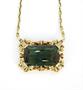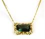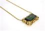 Velmi zajímavý náhrdelník v kombinaci žlutého a růžového zlata, kterému dominuje výrazný zdobný závěs s velkým syntetickým turmalínem krásné temně zelené barvy. Zlato ryzosti 585/1000, prvorepublikový punc lvíček. Rozměry závěsu 2,3 x 3,5 cm, délka řetízku 35 cm, tzn. že náhrdelník efektně přiléhá ke krku v krátké vzdálenosti. Celková hmotnost náhrdelníku 21,49 g.