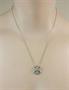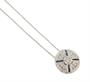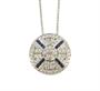 Náhrdelník z bílého zlata ryzosti 585/1000 zdobený diamanty briliantového brusu o celkové hmotnosti 0,70 ct a 12 modrými safíry o celkové hmotnosti . Průměr přívěsku 1,7 cm. Délka řetízku 45 cm. Celková hmotnost 3,36 g.