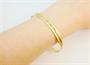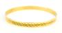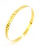 Zlatý kruhový náramek ryzosti 585/1000 zdobený gravírováním po obvodu. Celková hmotnost je 12,37 g. Průměr náramku je 7 cm.