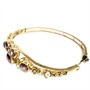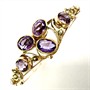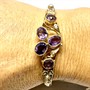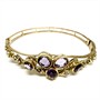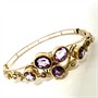 Půvabný, velmi starý kruhový náramek ze zlata. Šperk zdobí fazetově broušené, sytě fialové ametysty a drobné říční perly. Drahé kameny jsou přírodního původu. Zlato ryzosti 333/1000, kameny zasazeny ve zlatě ryzosti 585/1000. Celková váha náramku 9,59 g. Průměr 5,7 cm. Profesionálně vyčištěno zlatníkem, výborný stav.