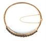 Kruhový náramek z růžového zlata z konce 19. století ze zlata ryzosti 585/1000 zdobený českými granáty. Rozměry 6 x 5,2 cm. Celková hmotnost 14,49 g. Náramek je označen rakousko-uherským puncem AV. Náramek je opatřen pojistným řetízkem. Šperk je ve výborném stavu.