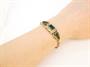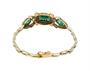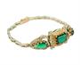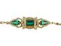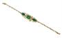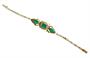 Výrazný, velmi zdobný článkový náramek ze zlata ryzosti 585/1000 zdobený zelenými syntetickými turmalíny sytě zelené barvy o celkové hmotnosti 6,6 ct a diamanty o celkové hmotnosti 0,60 ct. Délka náramku 18 cm. Celková hmotnost 16,90 g.