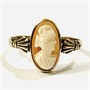 Elegantní, jemný prsten osazený oválnou oranžovo-bílou kamejí s podobiznou antikizující ženy, ramena šíny s plastickou lasturovitou aplikou. Tuzemská zlatnická práce z počátku 20. let 20. století.