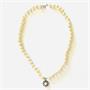 Elegantní náhrdelník se šňůry přírodních kultivovaných mořských smetanově bílých perel, ty vynikají svou téměř dokonalou kulatostí, průměrem 7-7,5 mm a vysokým leskem. Doplněno o centrální ozdobu v podobě květu, ta je osazena perlou téhož druhu a 8 přírodními modrými safíry kulatého brusu, dále zušlechtěno technikou "milgrain" (tisíc zrnek). Vkusný, tradiční šperk, západoevropská práce z 3. čtvrtiny 20. století.