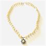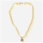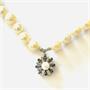 Centrální ozdoba zhotovena z bílého 18 karátového zlata, tj. o ryzosti 750/1000, zapínací z bílého 14 karátového zlata, tj. o ryzosti 585/1000; nově opatřeno puncem Z-58 (labuť 4) a ryzostní číslo na koncových očkách. Hmotnost 36,91 g, celková délka 45,5 cm, centrální ozdoba 20 mm. Nově převlečeno, perly jsou mezi sebou pečlivě uzlíkovány. Zapínání formou pérového kroužku v pořádku, celkově ve velmi zachovalém stavu.