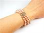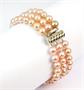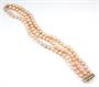 Trojřadý náramek z růžových sladkovodních perel o průměru 6-6,5 mm se zapínáním z bílého zlata ryzosti 585/1000. Délka náramku 19 cm. Celková hmotnost 37 g.