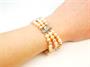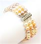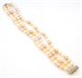 Trojřadý náramek ze světlých růžových, fialových a bílých perel o průměru 6-6,5 mm se zapínáním z bílého zlata ryzosti 585/1000. Délka náramku 19 cm. Celková hmotnost 37 g.