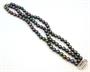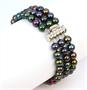 Trojřadý náramek z tmavých pavích perel o průměru 6-6,5 mm se zapínáním z bílého zlata ryzosti 585/1000. Délka náramku 19 cm. Celková hmotnost 37 g.