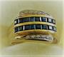 Široký zlatý prsten,přírodní safíry, brilianty jednoduchého brusu, zlato 585/1000, váha 6,9g, velikost 54.