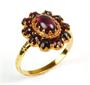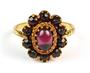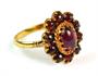 Prsten ze zlata ryzosti 585/1000 zdobený almandiny. Šína prstenu je zlatá, kameny jsou osazeny do obecného kovu. Rozměry hlavy prstenu 1,5 x 1,3 cm. Celková hmotnost je 3,04 g. Velikost 55.K prstenu je osvědčení Puncovního úřadu.