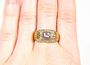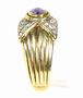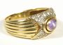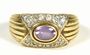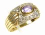 Zlatý prsten zdoben světle fialovým ametystem a zirkony, zlato ryzosti 585/1000 (punc labuť). Velikost: 58. Celková hmotnost 4,63 g.