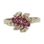 Prsten z bílého zlata ryzosti 585/1000, hlava prstenu ve tvaru stylizovaného květu je zdobena rubíny a diamanty briliantového brusu o celkové hmotnosti 0,12 ct. Velikost 57. Celková hmotnost 4,10 g.