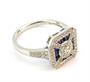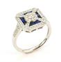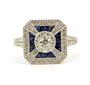 Prsten z bílého zlata ryzosti 585/1000 zdobí přírodní diamanty briliantového brusu celkové hmotnosti 0,46 ct a safíry 0,52 ct. Velikost prstenu 54-55, celková hmotnost 3,86 g.