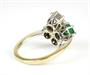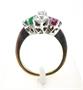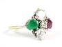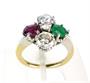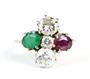 Prsten ze zlata ryzosti 750/1000 zdobený smaragdem, rubínem a brilianty o celkové hmotnosti 1,30 ct, barvy H, čistoty VS a barvy G, čistoty P. Celková hmotnost prstenu: 4,55 g. Velikost 48.