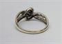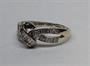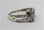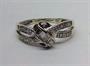 Jednoduše elegantní proplétaný prsten z bílého zlata s hlavou osazenou 10 diamanty bagetového brusu a s 10 diamanty jednoduchého kulatého brusu na bocích, celkem 0,20 ct. Celková hmotnost 2,50 g, Au 375/1000, platný britský punc, označení hmotnosti kamenů. Velká Británie, poslední třetina 20. století. Šířka prstenu 0,9 cm. velikost 56.