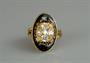 zlatý prsten s černým smaltem a diamanty starého briliantového brusu (ovály, obdélníky, čtverec) o celkové hmotnosti cca 1 ct, pěkná brilance, Au btto 5,8 g/750/000, západní Evropa, kolem r. 1880; velikost hlavy 2,1 x 1,3 cm, drobná oprava šíny; atest Puncovního úřadu; velikost prstenu 51