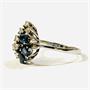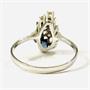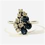 Elegantní, koktejlový prsten s asymetricky tvarovanou hlavicí, ta je osazena přírodními diamanty kulatého briliantového brusu o celkové hmotnosti cca 0,28 ct (7 ks - 0,04 ct), jejich kvalita je dobrá. Kombinováno s přírodními modrými safíry kapkového brusu o celkové hmotnosti cca 0,60 ct, fasováno decentními krapnami. Nadčasový design, kvalitní západoevropská zlatnická práce ze 4. čtvrtiny 20. století.