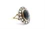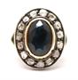 Zlatý prsten s diamanty a safírem. Žluté zlato 690/1000, kameny zasazeny ve stříbře 900/1000. Safír 2,6 ct. Přírodní diamanty - routy, kvalita SI1 - I1, barva H - J, celková váha 0,6 ct. Váha prstenu: 4,65 g. Velikost prstenu: 50. Osvědčení puncovního úřadu.