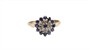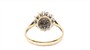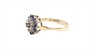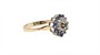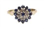 Zlatý prsten s diamanty a safíry. Bílé a žluté zlato 375/1000. Přírodní safíry, celková váha 0,35 ct. Přírodní diamanty, kvalita SI1 - SI2, barva H - I, celková váha 0,1 ct. Váha prstenu: 2,07 g. Velikost prstenu: 52.