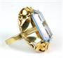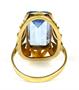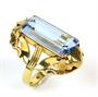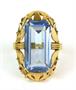 Výrazný, zlatý prsten osazený blankytně modrým spinelem. Šperk byl zhotoven ze žlutého zlata o ryzosti 585/1000 a hmotnosti 5,90 g. Velikost 51. Rozměr kamene 1,7 x 0,9 cm.