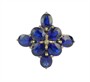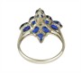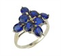 Moderní prsten s hlavicí stavěnou na ose řeckého kříže, osazeno přírodními modrými safíry oválného briliantového brusu o celkové váze 3,60 ct (0,045 ct - 8 ks), kvalita velmi dobrá, ve středu doplněno přírodním diamantem kulatého jednoduchého brusu (achtkant) o váze 0,005 ct. Pečlivě fasováno krapnami na hlavici s průsvitkami. Kvalitní birminghamská zlatnická práce z první pětiny 21. století.