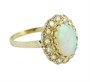 Prsten z bílého zlata ryzosti 585/1000 osazený oválným opálem lemovaným diamanty briliantového brusu o celkové hmotnosti 0,80 - 0,90 ct. Celková hmotnost prstenu je 4,60 g. Velikost 58.
